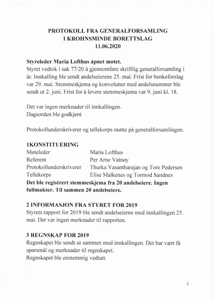 Protokoll fra generalforsamling i Krohnsminde Borettslag 11.06.2020 av Krohnsminde borettslag | jul 8, 2020 | Oppslag